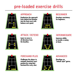 Program up to 6 custom drills with each drill having up to 6 shots. The player can select from one of 6 ball locations on the court while assigning an independent location, ball speed, ball spin, and ball feed rate for each shot - the sequences are infinite.
