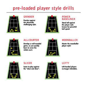 Pre-loaded drills: power baseliner, all-courter, grinder, moonballer, slicer, lefty, forehand plus, attack/defend, approach, beginner, intermediate, advanced